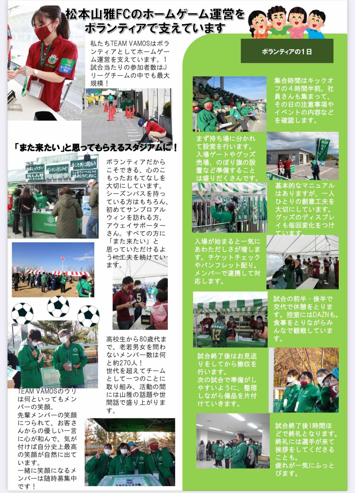 2026年の松本山雅FCホームゲームを安心・安全に運営していくために、TEAM VAMOSでも「新たな力」を求めております。ボランティアに関する疑問や興味がある方のために活動内容をご説明いたします。
